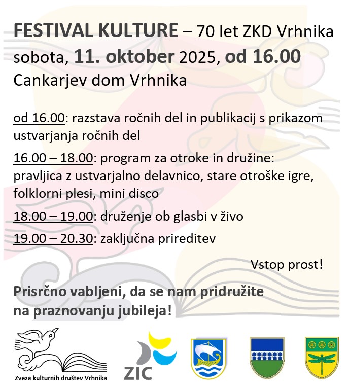 11. 10. 2025 | Festival kulture ob 70-letnici ZKD Vrhnika, Cankarjev dom Vrhnika, sodeluje KUD Drenov Grič – Lesno brdo (vabilo in program) | 16.00 – 20.30 |